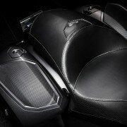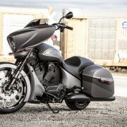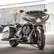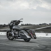 The bike’s grey paintwork is finished in a matt grey that Victory describes as a ‘suede monochrome’ that covers every inch of bodywork. Chrome is replaced with black on the engine, with the same finish on the frame and exhaust. The billet aluminium wheels are also black, with polished strips picking out the edges of the spokes.